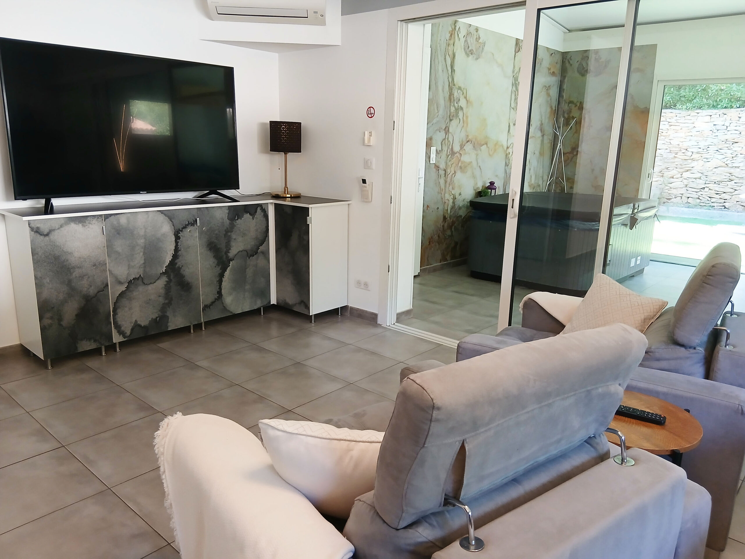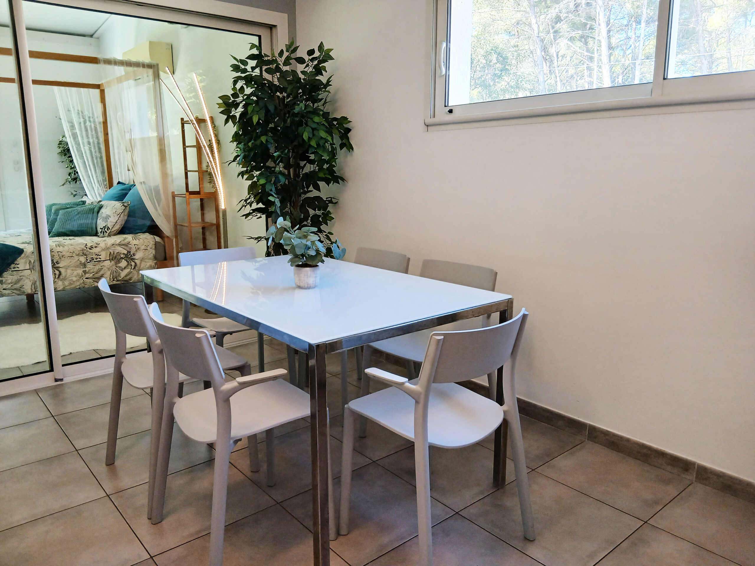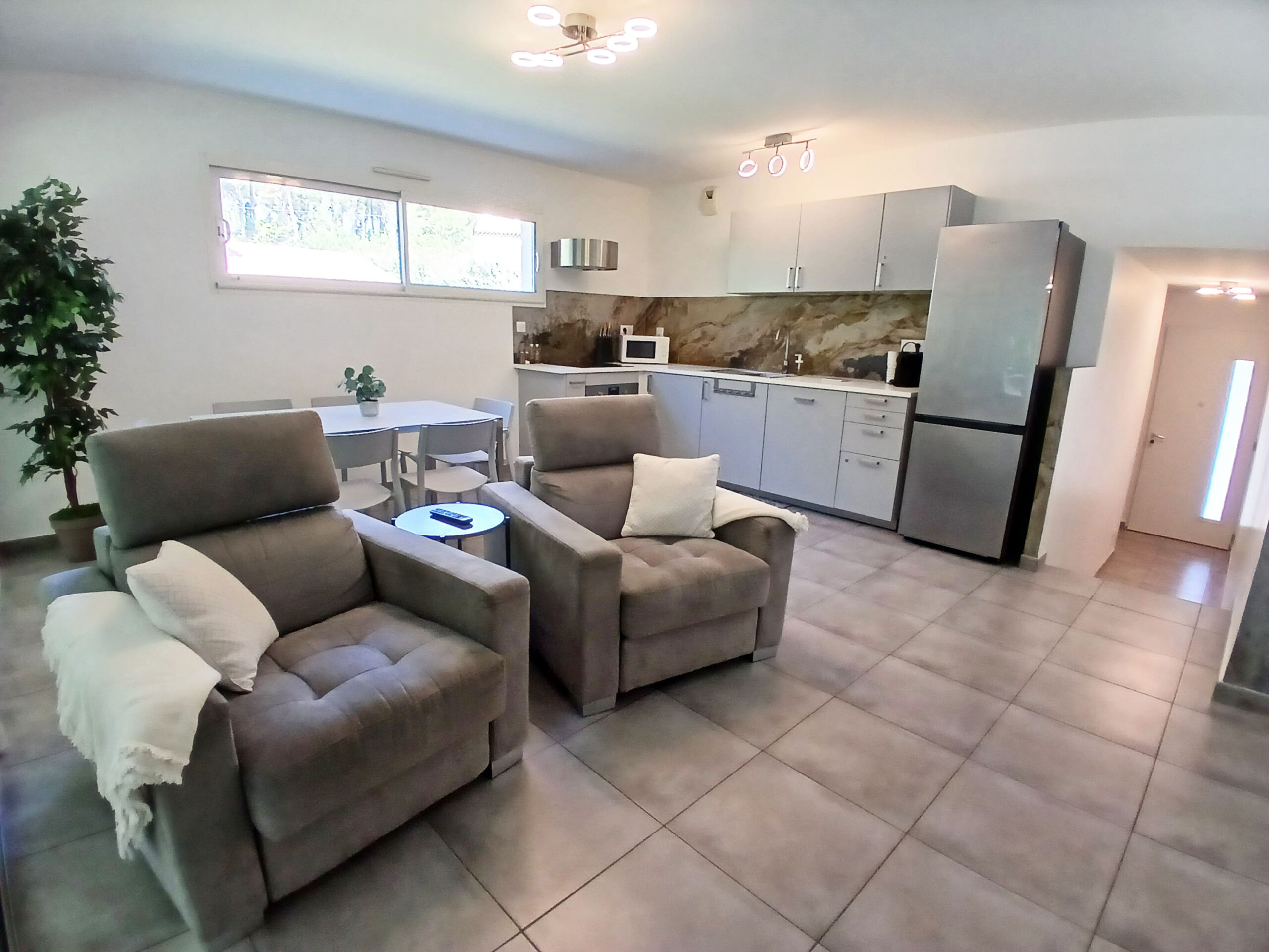 Grande maison californienne à demi-niveau de 97 m² entièrement meublée et équipée avec jacuzzi, jardins et parking privatifs, en zone pavillonnaire sous les pins, proche de toutes commodités.