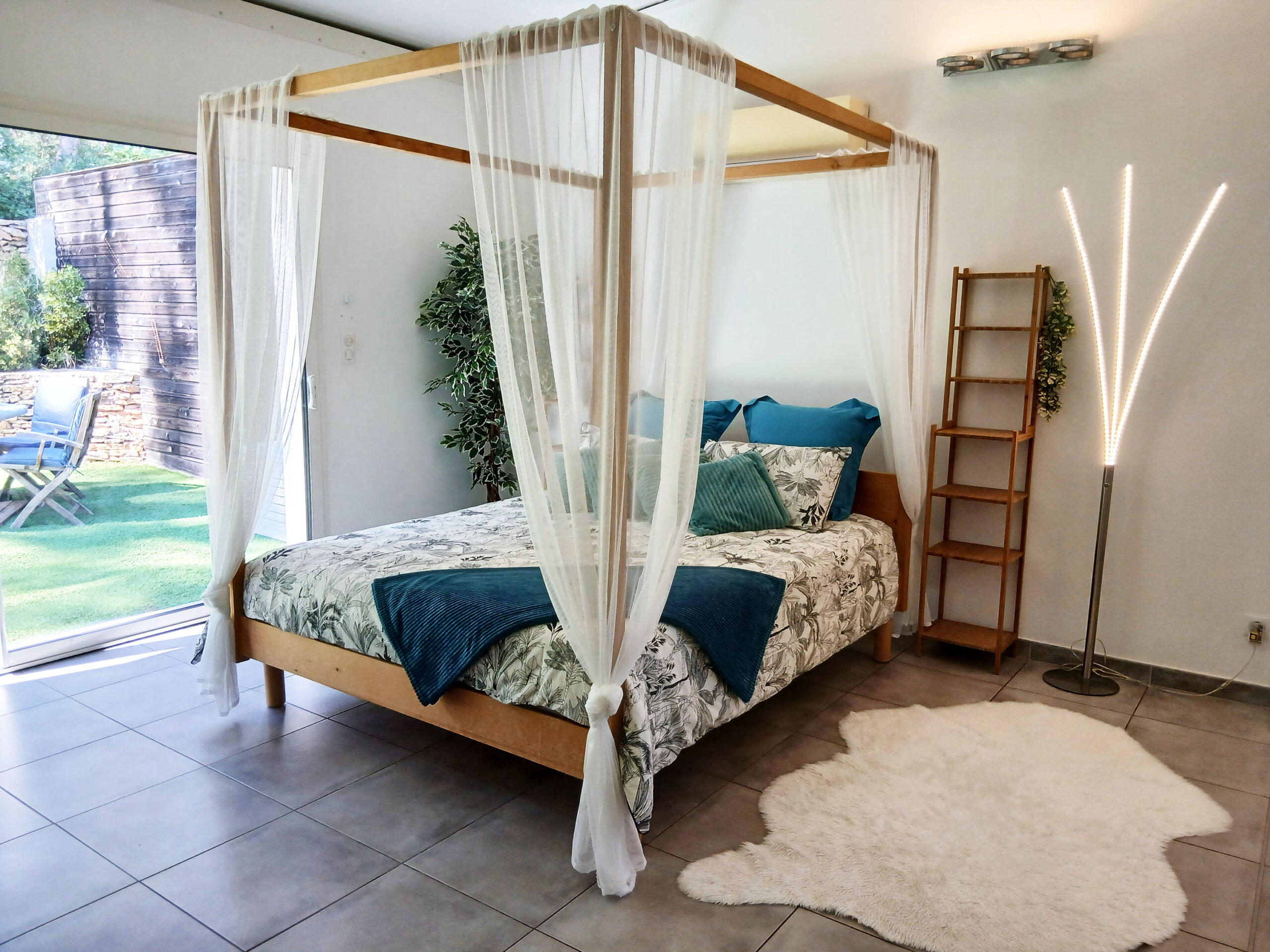 Sur pelouse synthétique d’environ 55m² exposé sud-ouest, au calme face aux pins, avec table plancha à cuisson centrale au gaz, chaises, parasol, transats et un surprenant filet de catamaran tendu d’environ 8m² pour s’étendre sous ciel de Provence